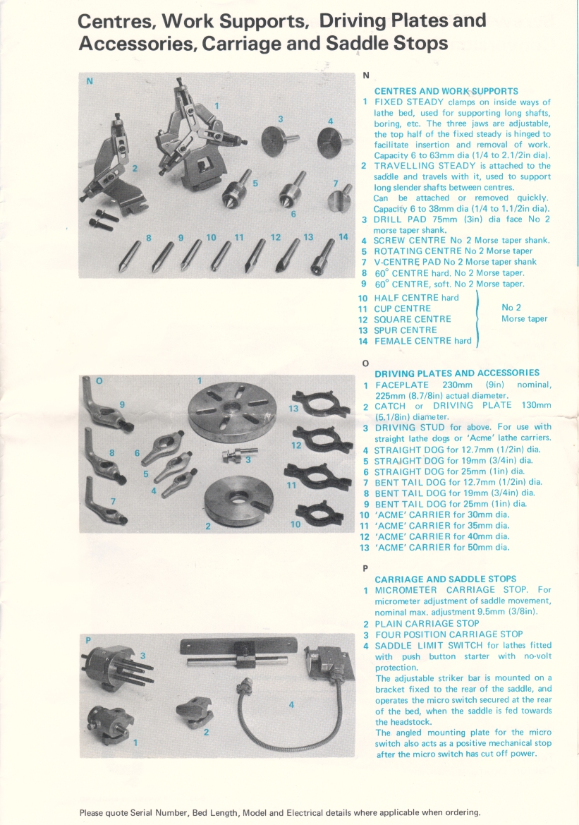 Boxford ME10 Lathe accessories and additional equipment as at 1982