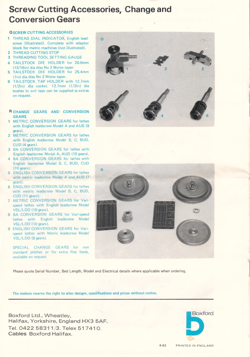 Boxford ME10 Lathe accessories and additional equipment as at 1982