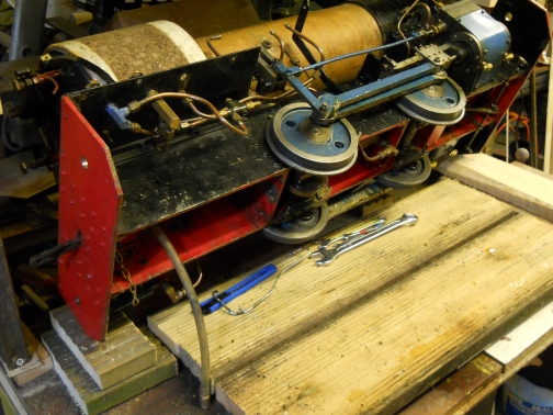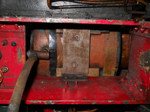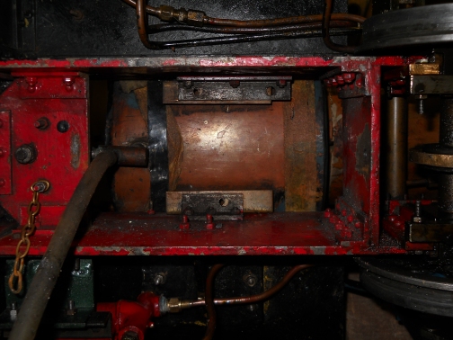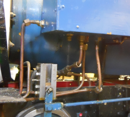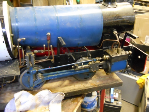 The rear of the loco was raised to give access to the pony truck was released by the two locking nuts at the front and the chain at the rear and removed. The loco was then rolled onto its side to enable release to the lower boiler fixing bolts. The retaining double plate when loosed was then removed off the front end of the boiler retaining brackets. The rear boiler band could still not be removed !! The blower pipe was removed from within the smoke box The two large steam pipe nuts were released from within the smokebox. Then with a slight wiggle of the boiler the two steam union parts separated The drain down stop value was removed and placed in the blue box The regulator was removed and care taken not to touch the "O" Rings which were separately removed and placed in a tissue. The rear boiler band could now be removed followed by the cladding.