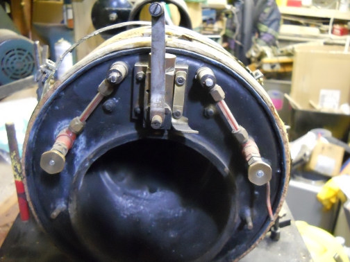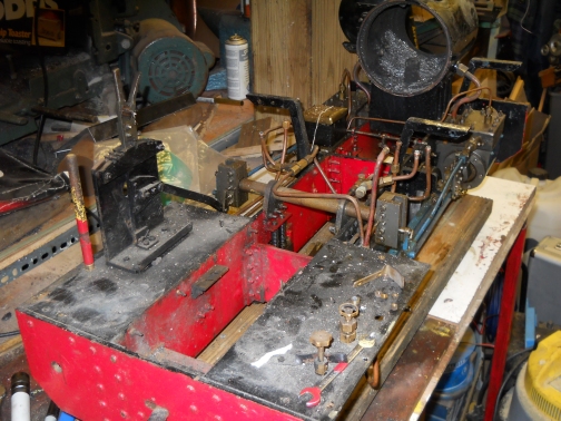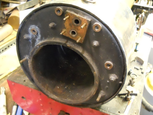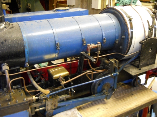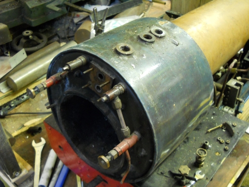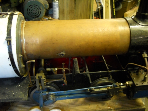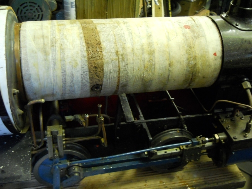Day - - 5 3rd Feb 2012 A very cold day so some curtaining had to be put up to halve the size of the generally heated area The feed pipe from the left hand water tank was disconnected. The side tank was then unbolted and the two 4 BA nuts and bolts put in bag no.1 The two pipe to the double clack were released. The blower pipe was released from the front union and removed rearwards. The double clack was removed and placed in the blue box as it will be needed as a pattern to make a new clack. The boiler band nearest to the smoke box was removed and marked as no.1 Similarly followed bands 2 3 4 and 5.