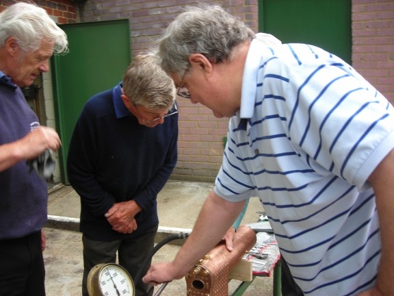15th July 2010 The boiler was tested by MMES and now has a 4 year Hydraulic Test Certificate. Initially one of the bungs let go an "O" ring at 110psi but a simple mod of using the rubber seal in place of the "O" ring and some PTFE on the threaded shaft at the rear of the boiler and the test was successful at 160psi. On the left is Dave then to the right is Peter, Bernie's hand is on the boiler and I am pumping to maintain pressure at 160psi as the pump leaked very slightly. |