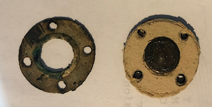 | 7th April 2026 Bolts to retain the cover of the regulator valve were cut to length and filed off in the latch so that they easily will enter the 6BA threaded hole. A thicker gasket which had made earlier fitted exactly. the gasket on the left is the original and the one on the right the new one. The retaining cove was then cleared up with Isopropanol. |