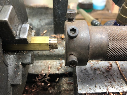 | 30 March 2026 With the hole drilled as near to size of the tap it meant that the piece of steel wobbled about . So I held the drill in the headstock of the lathe and drill a cente hole into which I positioned the revolving centre. I was the able to machine of the eccentricity and the tap would cut straight. |
