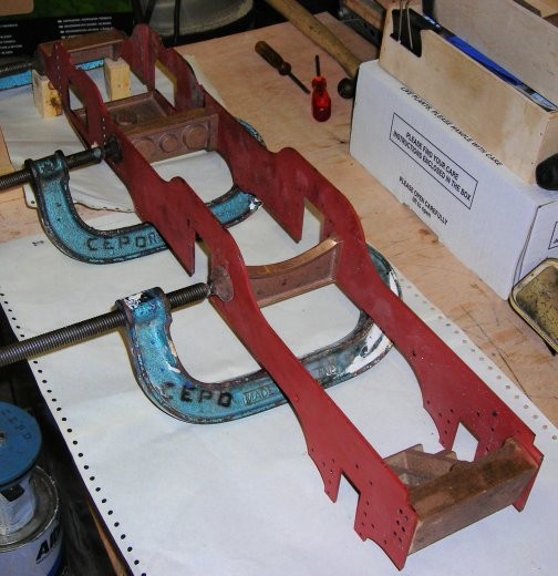 In the picture you can see the rear drag box held in position with machine tool makers clamps ready for the holes to be drilled and with the trailing horn blocks in place. |