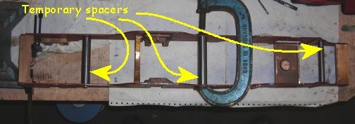 | From the picture above right the assembly now has temporary spacers that I hope will hold everything in place whilst the holes are drill and tapped to the M4 countersunk bolts. The plans show to use 4BA but it seems that there is a change fast approaching where the BA bolt will be a thing of the past so I thought better to change NOW! | ![]() |