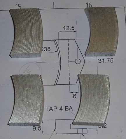 I saw the brake shoes had a curved surface. Then I found in the scrap bin a piece of aluminium casting that had held goodness know what and which I had been given years ago by my father in law Don Bruce. The casting was in fact much larger than the piece you see in the picture as I had to mount the piece in the lathe and scribe a semi circle and then drill and cut to make it fit the lathe. Still I know - well hoped that it would make the brake shoes. I machined it to size and then marked in pencil the lines you can see of the individual brake shoes and found that "YES" there was just enough material to make the brakes for the first truck. What I shall do for the second truck I do not know !!!! |