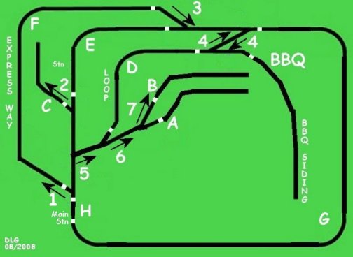All points and most of the signals are now operational. The 25th of August will be the first anniversary of the DLR so today a BBQ was held and a new wall chart devised to assist with switching the points correctly. The points are numbers 1 - 7 and the arrow indicates when the pneumatic switch is throw the direct of travel. Letter A B and BBQ indicate the siding that have electrical isolation C is yet to be carried out. Future plans include providing BLOCK working in sections D E F G & H |
