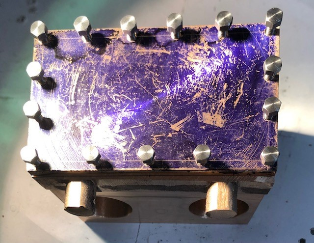 | 26th April Cut the heads off the bolts located the centre of the Steam chest cover and drilled a pilot hole. |