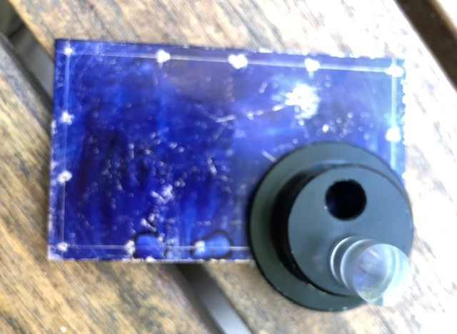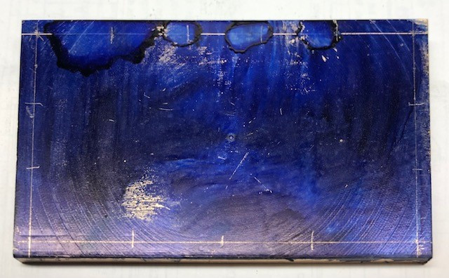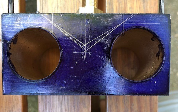 | 19th April The steam chest top is now coloured withthe marking out blue. The holes to be drilled must be carefully marked out so the they miss the steam ways. When marked they will then be centre popped using my optical centre punch and then drilled taping drill size for 4BA bolts. Eventually the holes will be opened up to clearance size for 4BA in both the steam chest and the steam chest top but not until the holes in the steam chest and cylinders have been drilled with the tapping drill as those in the cylinder need to be tapped 4BA. |
