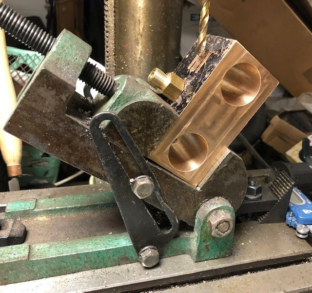 | 3rd May 2022 After a few days thought I set up the angle vice and held the cylinder block as shown ( actually this is as it was for the second hole). The angle was checked as on the drawing above and the DRO used to indicate the depth. First a centre drill eas used to make a location for the 1/4" drill which was then used to drill down to the vertical hole drilled previously. A piece of plastic hose was then placed into the exhaust hole and blown through top prove the exhaust way was clear. Then the block was reversed to as shown in the photo and the same procedure to centre drill fist and then the 1/4" drill but the angle and position on the bed remained unchanged. The cylinder block was then removed and a good blow through (with eyes closed) to ensure that both ways were filly clear. |