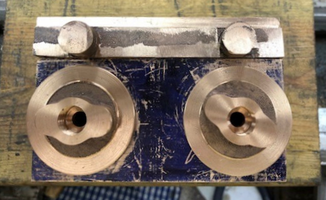 could be drilled in the cover and the steam chest. The front edge of trhe steam chest was stamped with an T to indicate top so that there could be no mistake. |
