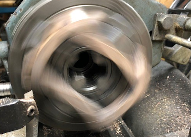 | 18th April The steam chest was held in a 4 jaw chuck and after measurement the fist side brought to size. The unit was then turned over in the 4 jaw chuck and the other side machined to bring the unit to the overall thickness required. The inside was then cleaned up with hand file and my small battery belt sander. |